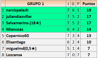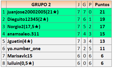 Deja un comentarioEn está página se irán publicando los resultados de las diferentes partidas, siendo ambos jugadores responsables de subirlos o de comprobar que ya hayan sido publicados insertando un COMENTARIO en la parte inferior de la pantalla (opción “Deja tu comentario”), indicando el nombre de los dos jugadores y los puntos obtenidos en la partida.