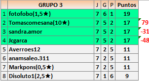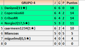 Deja un comentarioEn está página se irán publicando los resultados de las diferentes partidas, siendo ambos jugadores responsables de subirlos o de comprobar que ya hayan sido publicados insertando un COMENTARIO en la parte inferior de la pantalla (opción “Deja tu comentario”), indicando el nombre de los dos jugadores y los puntos obtenidos en la partida.