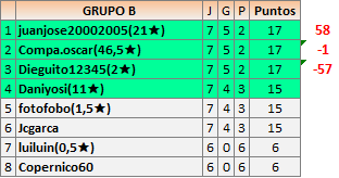 Deja un comentarioEn está página se irán publicando los resultados de las diferentes partidas, siendo ambos jugadores responsables de subirlos o de comprobar que ya hayan sido publicados insertando un COMENTARIO en la parte inferior de la pantalla (opción “Deja tu comentario”), indicando el nombre de los dos jugadores y los puntos obtenidos en la partida.
