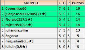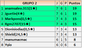 Deja un comentarioEn está página se irán publicando los resultados de las diferentes partidas, siendo ambos jugadores responsables de subirlos o de comprobar que ya hayan sido publicados insertando un COMENTARIO en la parte inferior de la pantalla (opción “Deja tu comentario”), indicando el nombre de los dos jugadores y los puntos obtenidos en la partida.