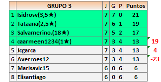 Deja un comentarioEn está página se irán publicando los resultados de las diferentes partidas, siendo ambos jugadores responsables de subirlos o de comprobar que ya hayan sido publicados insertando un COMENTARIO en la parte inferior de la pantalla (opción “Deja tu comentario”), indicando el nombre de los dos jugadores y los puntos obtenidos en la partida.