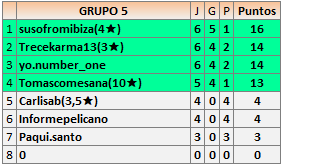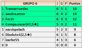 Deja un comentarioEn está página se irán publicando los resultados de las diferentes partidas, siendo ambos jugadores responsables de subirlos o de comprobar que ya hayan sido publicados insertando un COMENTARIO en la parte inferior de la pantalla (opción “Deja tu comentario”), indicando el nombre de los dos jugadores y los puntos obtenidos en la partida.