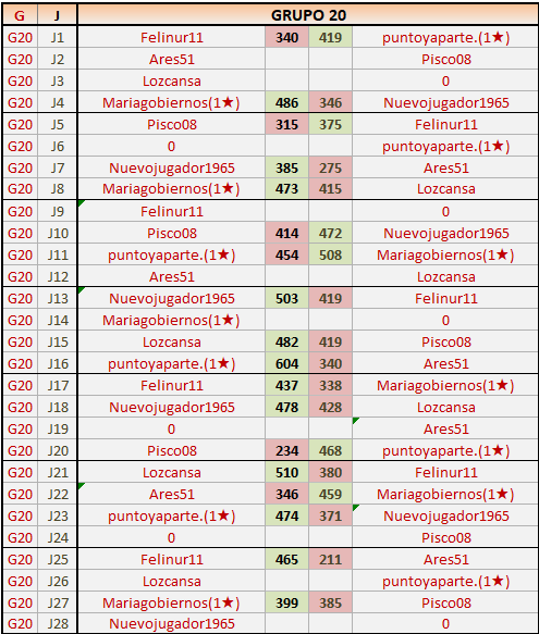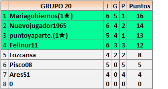 Deja un comentarioEn está página se irán publicando los resultados de las diferentes partidas, siendo ambos jugadores responsables de subirlos o de comprobar que ya hayan sido publicados insertando un COMENTARIO en la parte inferior de la pantalla (opción “Deja tu comentario”), indicando el nombre de los dos jugadores y los puntos obtenidos en la partida.