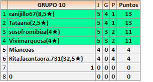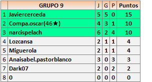 Deja un comentarioEn está página se irán publicando los resultados de las diferentes partidas, siendo ambos jugadores responsables de subirlos o de comprobar que ya hayan sido publicados insertando un COMENTARIO en la parte inferior de la pantalla (opción “Deja tu comentario”), indicando el nombre de los dos jugadores y los puntos obtenidos en la partida.