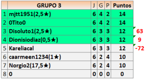 Deja un comentarioEn está página se irán publicando los resultados de las diferentes partidas, siendo ambos jugadores responsables de subirlos o de comprobar que ya hayan sido publicados insertando un COMENTARIO en la parte inferior de la pantalla (opción “Deja tu comentario”), indicando el nombre de los dos jugadores y los puntos obtenidos en la partida.