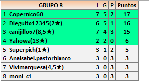 Deja un comentarioEn está página se irán publicando los resultados de las diferentes partidas, siendo ambos jugadores responsables de subirlos o de comprobar que ya hayan sido publicados insertando un COMENTARIO en la parte inferior de la pantalla (opción “Deja tu comentario”), indicando el nombre de los dos jugadores y los puntos obtenidos en la partida.
