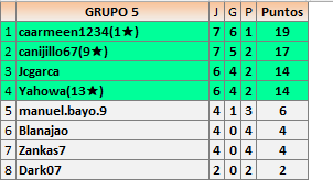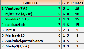 Deja un comentarioEn está página se irán publicando los resultados de las diferentes partidas, siendo ambos jugadores responsables de subirlos o de comprobar que ya hayan sido publicados insertando un COMENTARIO en la parte inferior de la pantalla (opción “Deja tu comentario”), indicando el nombre de los dos jugadores y los puntos obtenidos en la partida.