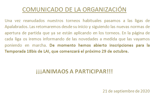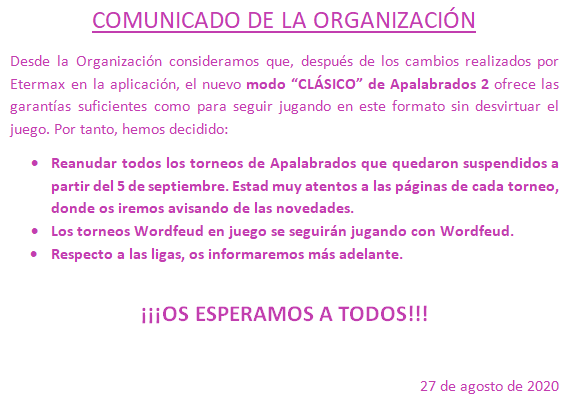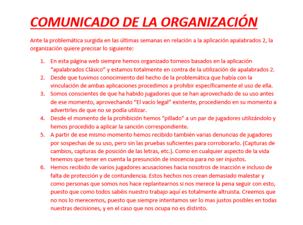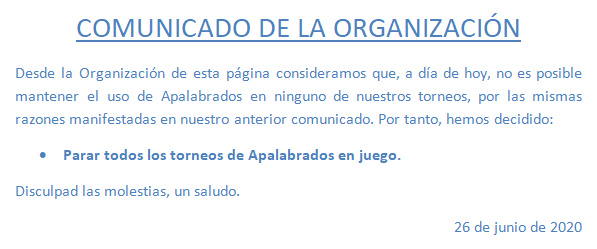 Si algún jugador se siente ofendido y quiere denunciar a su rival debe dirigirse a la organización exclusivamente por email a info@torneosapalabrados.com . Nosotros tomaremos las medidas pertinentes. Cualquier comentario de denuncia publicado en la web será inmediatamente borrado. En las pestañas de los torneos y ligas en curso, está únicamente autorizada la publicación resultados y temas relacionados con el desarrollo de las partidas.