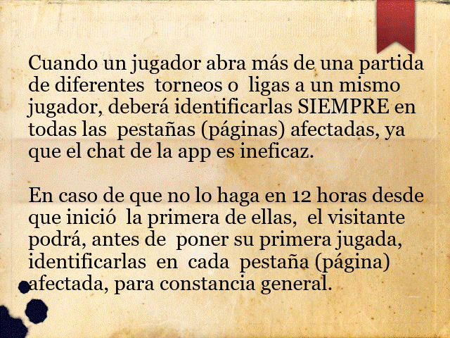 07/06/2017… «Dada la persistencia del mal funcionamiento del chat de la aplicación se anula hasta nuevo aviso la obligación de identificar de qué torneo se está retando. Será responsabilidad de cada jugador entrar en la web e identificar en el calendario los eventos recién comenzados, así como a sus rivales en las pestañas correspondientes. No obstante, se recomienda que se mantenga la costumbre de avisar los retos en el chat para facilitar la identificación en los casos en que éste funcione correctamente»