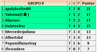 Deja un comentarioEn está página se irán publicando los resultados de las diferentes partidas, siendo ambos jugadores responsables de subirlos o de comprobar que ya hayan sido publicados insertando un COMENTARIO en la parte inferior de la pantalla (opción “Deja tu comentario”), indicando el nombre de los dos jugadores y los puntos obtenidos en la partida.