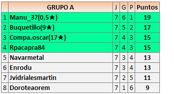 Deja un comentarioEn está página se irán publicando los resultados de las diferentes partidas, siendo ambos jugadores responsables de subirlos o de comprobar que ya hayan sido publicados insertando un COMENTARIO en la parte inferior de la pantalla (opción “Deja tu comentario”), indicando el nombre de los dos jugadores y los puntos obtenidos en la partida.