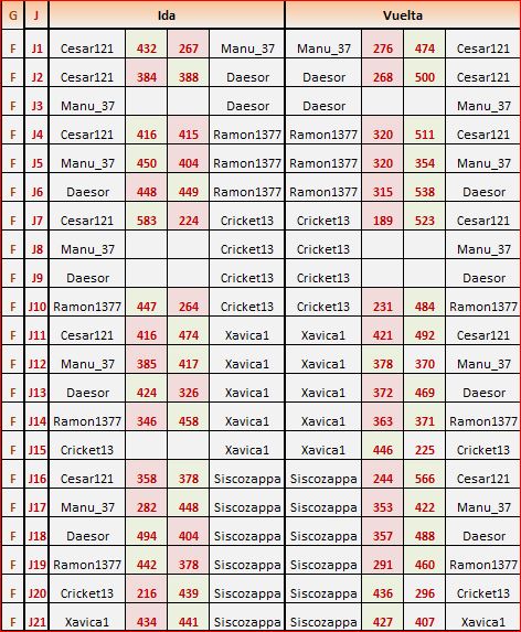 Deja un comentarioEn está página se irán publicando los resultados de las diferentes partidas, siendo ambos jugadores los responsables de subirlos, o comprobando que ya hayan sido subidos, insertando un COMENTARIO en la parte inferior de la pantalla (opción “Deja tu comentario“), indicando el nombre de los dos jugadores y los puntos obtenidos en la partida.