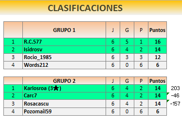 Los jugadores que se encuentran en la zona verde están clasificados para jugar las semifinales de la Comunidad de Extremadura (en juego a partir del 00:00 del 9 de dic). Los tres primeros clasificados de estas semifinales jugaran la fase Nacional del Campeonato de España.