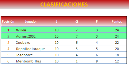 Los jugadores en la zona verde están clasificados para la Fase Nacional del Campeonato de España y para jugar las Semifinales de la Comunidad de Galicia.