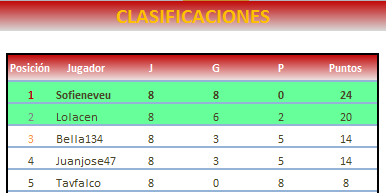 Deja un comentarioEn está página se irán publicando los resultados de las diferentes partidas, siendo ambos jugadores los responsables de subirlos, o comprobando que ya hayan sido subidos, insertando un COMENTARIO en la parte inferior de la pantalla (opción “Deja tu comentario“), indicando el nombre de los dos jugadores y los puntos obtenidos en la partida.