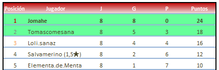 Los jugadores en la zona verde están clasificados para jugar la Fase Nacional del Campeonato de España y para la semifinal del la Comunidad de Murcia que comienzan el 9 de Diciembre a la 00:00