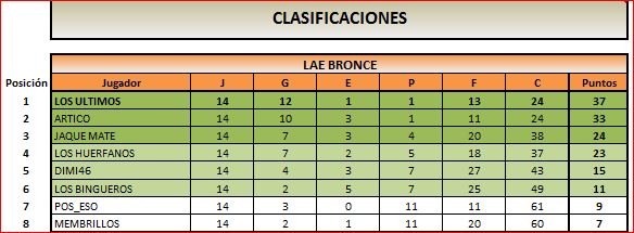 Pongo yo los resultados de la jornada 14, porque la partida entre jcat46 y bienvepilar se termino ayer a ultima hora y le comento la interesada que por favor terminara la partida porque hoy el capitan no podia poner los resultados.