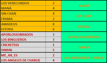 EN CASO DE EMPATE A 3 VICTORIAS DE CADA EQUIPO EL GANADOR SERÁ EL EQUIPO QUE TENGA MAS DIFERENCIA DE PUNTOS SUMANDO LAS 6 PARTIDAS