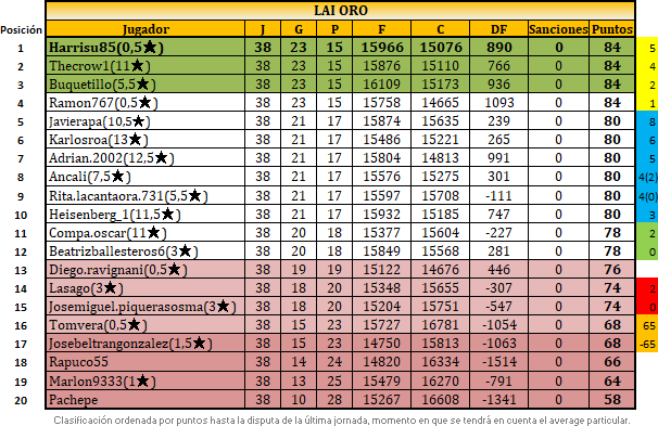 Y para finalizar y por alusiones, muchas gracias Javi, Rita y Carlos por vuestra felicitación, en ningún momento hasta las 4 últimas jornadas me planteé poder quedar 3° y menos aún tener opciones de ganar hasta el final, durante la liga solo quise divertirme y ganar el mayor número de partidas, quizás por eso me ha salido bien. Saludos a todos, la próxima temporada más…