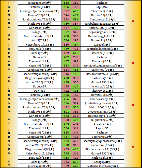 Mi Enhorabuena! a los 3 primeros clasificados! Menuda liga más competida e igualada en la que solo 4 victorias separan al ganador de los puestos de descenso.