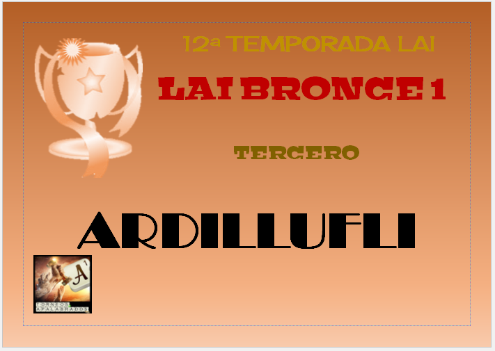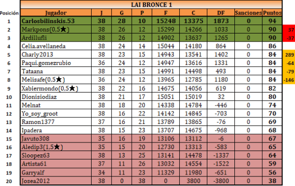 !!!!ENHORABUENA !!Al CAMPEON SUBCAMPEON Y TERCERO y porsupuesto a los que nos quedamos,a los que bajan !!un saludo los echaremos de menos y sobre todo ENHORABUENA a la ORGANIZACION por esta gran temporada de torneos, y insto a la misma que valoren para la proxima temporada de Lai Lam y Lae que las ultimas jornadas sean verificadas como en PLAY OFF no estaria nada mal!!!un saludo a todos y hasta Septiembre que seguiremos dando caña (para subir)