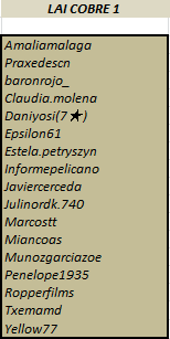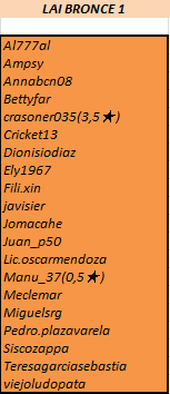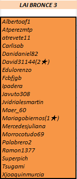 - ANNABCN08, DARK07, FELINUR11, LIC.OSCARMENDOZA, DABALGI, JOMACAHE, SLOOPEZ63, ATREVETE11 y CLAUDIAMAZIERES juegan en LAI Bronce.