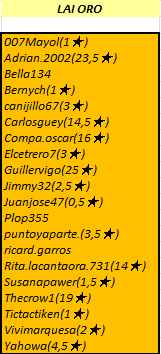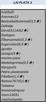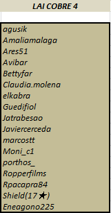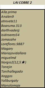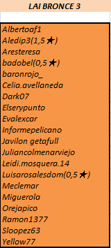- FILI.XIN, JAVIPAGASU, MARCOS.DELATORRE.7, DIONISIODIAZ, GUILLEPECA, CARLISAB, YO_SOY_GROOT, SISCOZAPPA, EVALEXCAR, FCBFJGB y ALBERTSBD juegan en LAI Bronce.