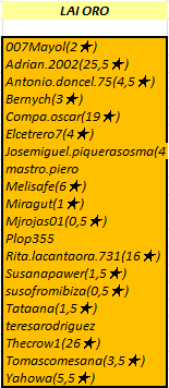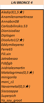 • RAYZAGAR, BETTYFAR, CRICKET13, ARESTERESA, INFORMEPELICANO, ALBERTO.CATALANO.52, YO_SOY_GROOT y DIONISIODIAZ juegan en LAI Bronce.