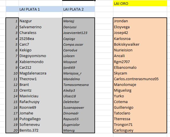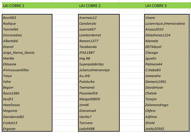 SI hubiera alguna baja hay varios jugadores de reserva que entrarían en LAI cobre, y si hubiera que ascender a algún jugador a categoría superior los jugadores con mejor ranking son Quiara ( mejor ranking en bronce) y Boni003 ( mejor ranking de cobre)