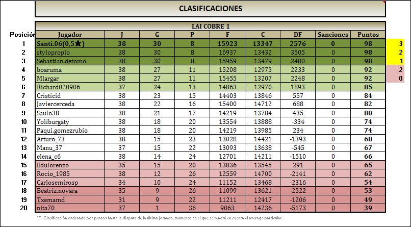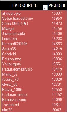 LAI COBRE 1 MEDIA PTOS GANAR PERDER LAI COBRE 1 PROMEDIO PUNTOS LAI COBRE 1 PROMEDIO VICTORIASCOBRE 1 DIPLOMA CAMPEÓNCOBRE 1 DIPLOMA SUBCAMPEÓNCOBRE 1 DIPLOMA TERCEROCOBRE 1 DIPLOMA PICHICHI