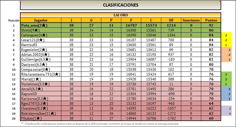 LAI ORO JORNADAS MEDIA PUNTOS LAI ORO JORNADAS PROMEDIO PUNTOS LAI ORO JORNADAS PROMEDIO VICTORIAS
