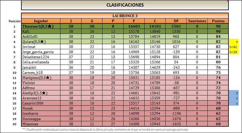 Hola yo creo que desi(quiara) ha explicado muy bien lo que ha pasado y es verdad que tal vez fue en la jornada 35-36 en la que aparecía con una partida menos, y no toda la temporada como he dicho antes, yo creo que le toca a la organización decidir si la partida con aledip entró en tiempo o no y de eso no tengo yo información y por tanto es a la organización a quien le toca decidir si entro en plazo o no, yo eso lo desconozco porque los comentarios se borran cada vez que suben los resultados publicados y explicar porque no se subió el resultado al cuadro, en cualquier caso y como siempre confío en el buen hacer, el buen criterio y la imparcialidad de la organización para dirimir estos casos y al igual que desi(quiara) no tengo tampoco ningún inconveniente en mantenerme en bronce una temporada más