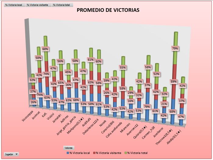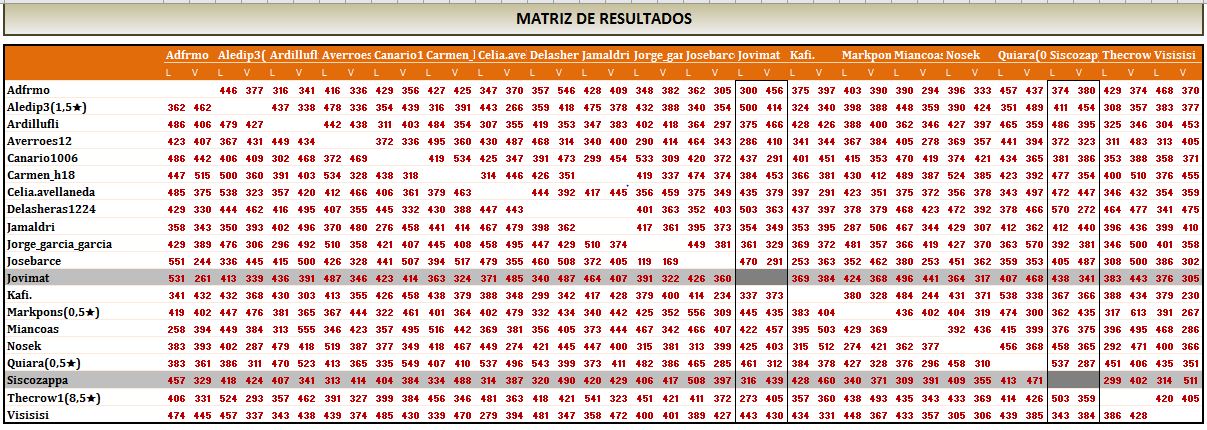 En la matriz puedes ver los resultados y los jugadores a los que les falta algún resultado pero nunca ha sido dicho jugador