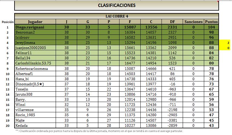 Hola, he entrado en la página para ver quién me toca en el cruce por el ascenso y veo que hay un error. Como bien decís, sólo hay que cambiar mi nick por el de Jereyjimena y al revés, para respetar los resultados; efectivamente me ganó ambas partidas, por lo que me corresponde el 5º puesto final.