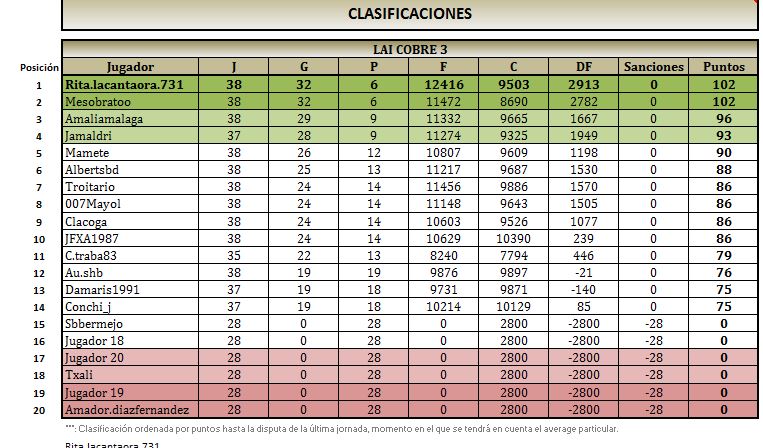 2. El PLAZO LÍMITE PARA EL ENVÍO DE RESULTADOS, se mantiene los domingos ( 9 días de juego), pero CAMBIA LA HORA LÍMITE, que será a las 21:00 horas DEL DOMINGO, para que la gente no tenga que estar hasta altas horas, ya que muchos madrugan, y las 24:00 era una hora tardía.