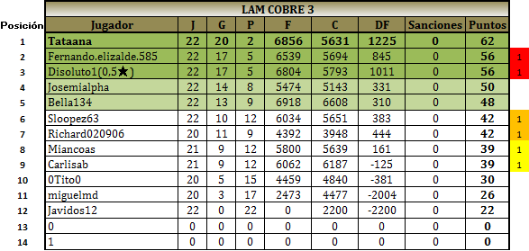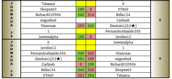 • La expulsión de JAVIDOS12 ha invalidado sus partidas, que se han considerado como 100-0 a favor del rival. Ésto ha modificado las clasificaciones finales del grupo.