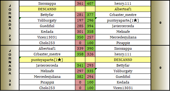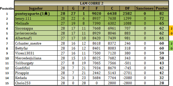 Enhorabuena a los que suben directo y a los que han conseguido un puesto para la promoción y que esta vez tengan suerte, en especial sisco y javier que son los que conozco más y que ya les tocaría subir, y que lástima con bettyfar a la que gané, que en estas últimas jornadas la han destronado de la promoción, bueno nos vemos en la siguiente.
