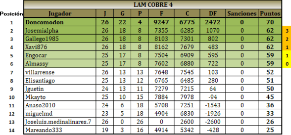 Jugarán 6 jugadores de oro, los 4 primeros por grupo de plata, 3 primeros por grupo de bronce, 2 primeros por grupo de cobre, y el mejor tercer clasificado de cobre.