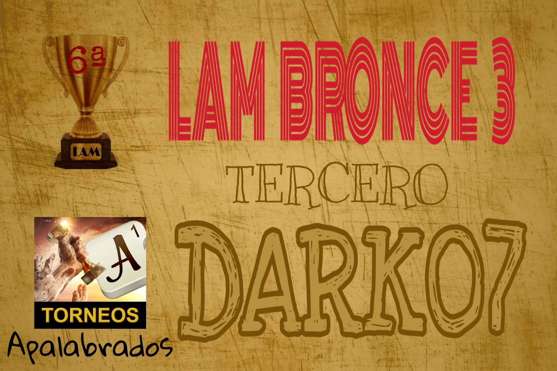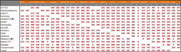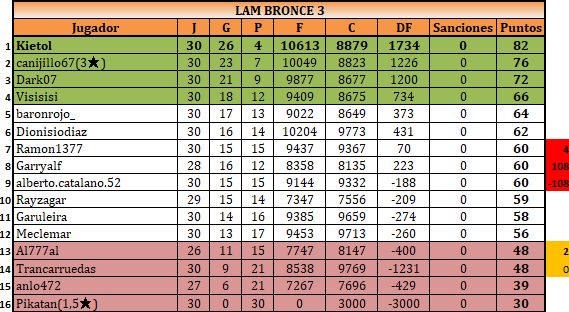 En este caso hay un triple empate a 60 puntos. Para resolverlo hay que mirar solo las 6 partidas disputadas entre los jugadores empatados. De ellas Ramon1377 gana 4, mientras que Garryalf y Alberto.catalano.52 ganan una cada uno. Por tanto, Ramon1377 queda el primero de los tres y los dos restantes siguen empatados. Pasamos entonces a mirar solo las dos partidas jugadas entre Garryalf y Alberto, donde cada uno ha ganado una, y resolvemos el empate a favor de Garryalf por ser el que tiene mayor diferencia de puntos.