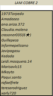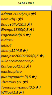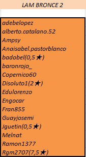 - RAFA.PUIGVERTPONTAQUE, FRAN855, AL777AL, SISCOZAPPA, MELNAT, TRANCARRUEDAS, BADOBEL, ANAISABEL.PASTORBLANCO, BETTYFAR, ROGERTOLEDO y RGM2707 juegan en Bronce.