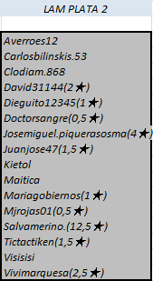 - VIVIMARQUESA, MARIAGOBIERNOS, CLODIAM.868, MAITICA, DIEGUITO12345, MAGDALENACORA y MARKPONS juegan en Plata.
