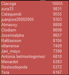 Además, quería felicitar a todo el grupo en general, porque salvo alguna recriminación que no venía a cuento, hemos sido competidores peleones pero ha primado la deportividad; respetuosos y educados (al menos conmigo así ha sido) y como me temo que no siempre es lo habitual, hay que congratularse por ello.