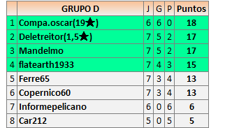 Deja un comentarioEn está página se irán publicando los resultados de las diferentes partidas, siendo ambos jugadores responsables de subirlos o de comprobar que ya hayan sido publicados insertando un COMENTARIO en la parte inferior de la pantalla (opción “Deja tu comentario”), indicando el nombre de los dos jugadores y los puntos obtenidos en la partida.