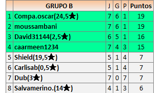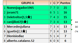 Deja un comentarioEn está página se irán publicando los resultados de las diferentes partidas, siendo ambos jugadores responsables de subirlos o de comprobar que ya hayan sido publicados insertando un COMENTARIO en la parte inferior de la pantalla (opción “Deja tu comentario”), indicando el nombre de los dos jugadores y los puntos obtenidos en la partida.