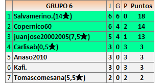 Deja un comentarioEn está página se irán publicando los resultados de las diferentes partidas, siendo ambos jugadores responsables de subirlos o de comprobar que ya hayan sido publicados insertando un COMENTARIO en la parte inferior de la pantalla (opción “Deja tu comentario”), indicando el nombre de los dos jugadores y los puntos obtenidos en la partida.