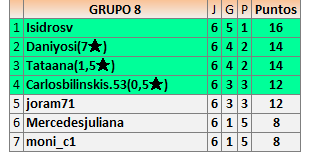 Deja un comentarioEn está página se irán publicando los resultados de las diferentes partidas, siendo ambos jugadores responsables de subirlos o de comprobar que ya hayan sido publicados insertando un COMENTARIO en la parte inferior de la pantalla (opción “Deja tu comentario”), indicando el nombre de los dos jugadores y los puntos obtenidos en la partida.