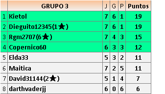 Deja un comentarioEn está página se irán publicando los resultados de las diferentes partidas, siendo ambos jugadores responsables de subirlos o de comprobar que ya hayan sido publicados insertando un COMENTARIO en la parte inferior de la pantalla (opción “Deja tu comentario”), indicando el nombre de los dos jugadores y los puntos obtenidos en la partida.