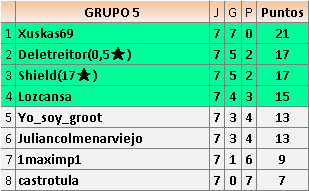 Deja un comentarioEn está página se irán publicando los resultados de las diferentes partidas, siendo ambos jugadores responsables de subirlos o de comprobar que ya hayan sido publicados insertando un COMENTARIO en la parte inferior de la pantalla (opción “Deja tu comentario”), indicando el nombre de los dos jugadores y los puntos obtenidos en la partida.