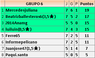 Deja un comentarioEn está página se irán publicando los resultados de las diferentes partidas, siendo ambos jugadores responsables de subirlos o de comprobar que ya hayan sido publicados insertando un COMENTARIO en la parte inferior de la pantalla (opción “Deja tu comentario”), indicando el nombre de los dos jugadores y los puntos obtenidos en la partida.