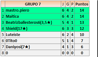 Deja un comentarioEn está página se irán publicando los resultados de las diferentes partidas, siendo ambos jugadores responsables de subirlos o de comprobar que ya hayan sido publicados insertando un COMENTARIO en la parte inferior de la pantalla (opción “Deja tu comentario”), indicando el nombre de los dos jugadores y los puntos obtenidos en la partida.